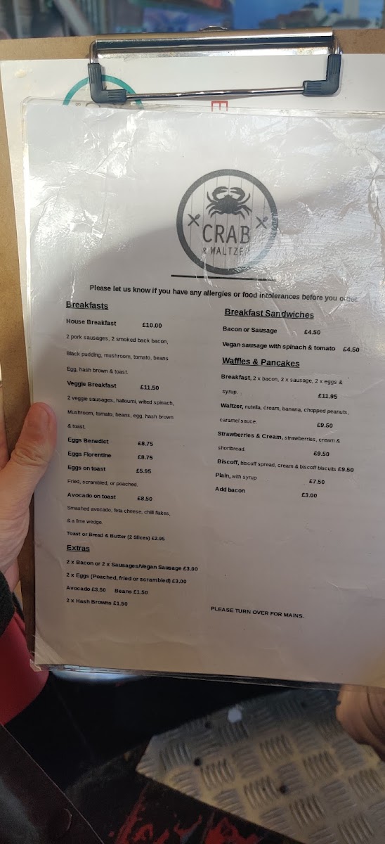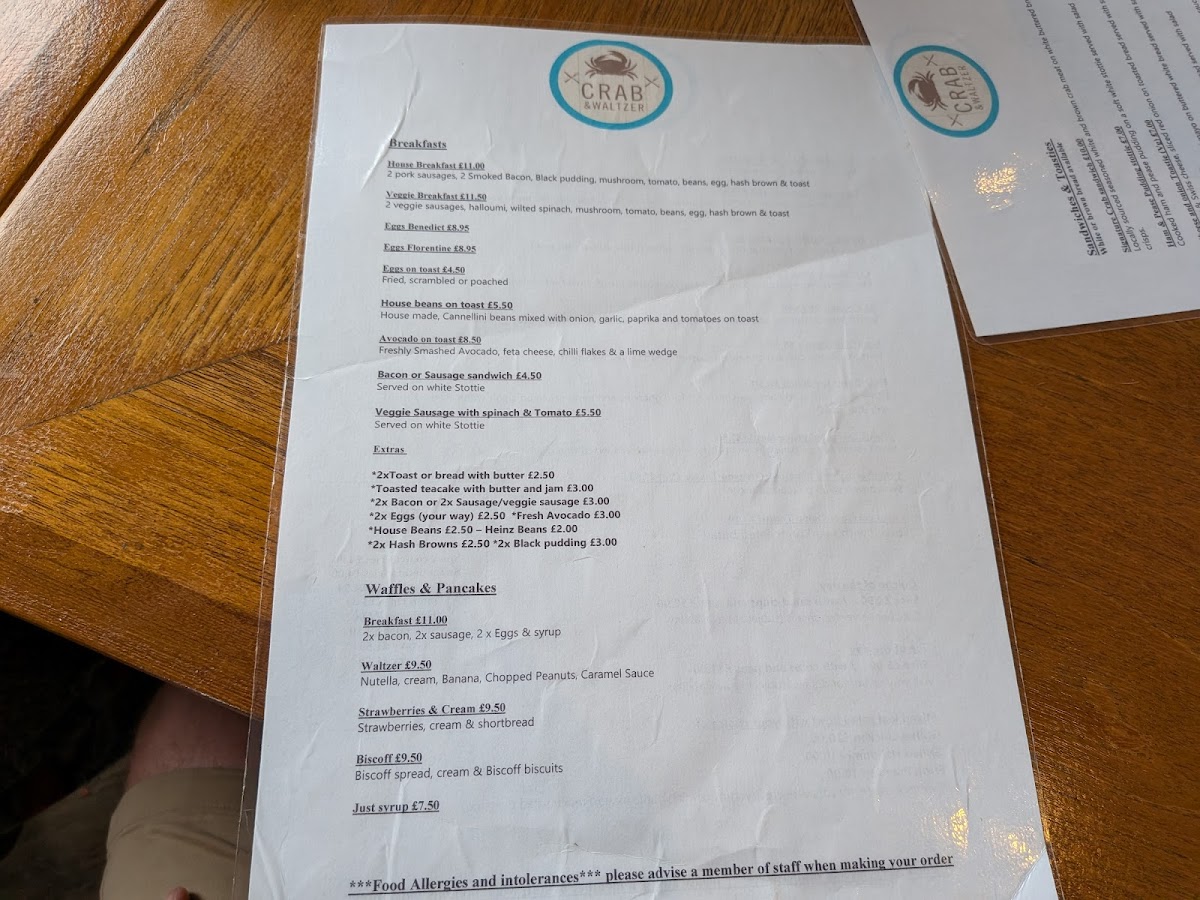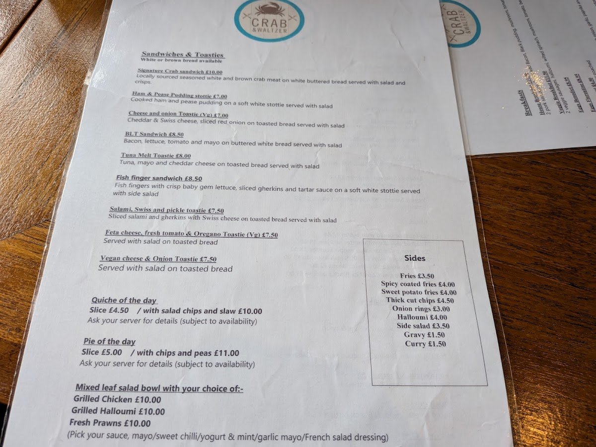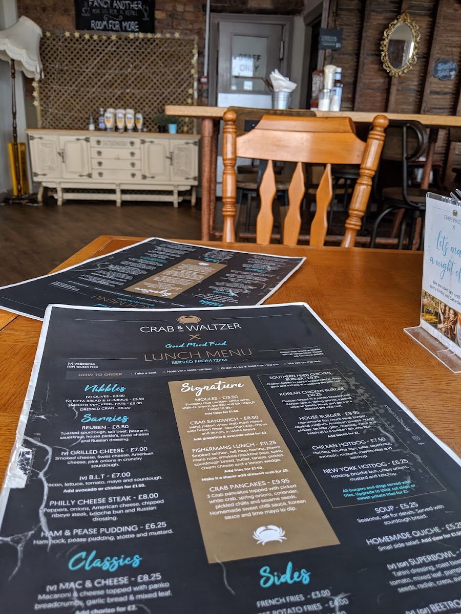 The menu at Crab & Waltzer offers a welcoming mix of comforting café staples and classic coastal dishes, perfect for relaxed breakfasts, casual lunches, or unwinding with friends over drinks. Whether you’re stopping by for a morning coffee and avocado on toast, or settling in for a hearty serving of fish and chips or their signature crab sandwich, the menu strikes a balance between familiar favourites and thoughtful local touches.